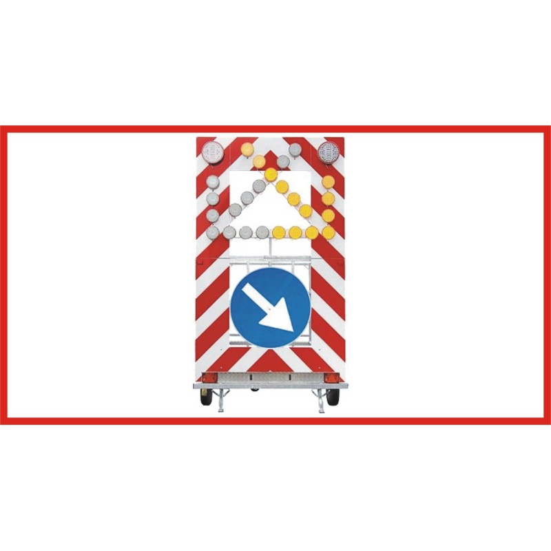 A303 Figura 401 c.d.s. Pannello luminoso a LED con figura 400 c.d.s. impianto luminoso a 25 luci sequenziali e pannello con figura 401 del codice della strada. installabile a richiesta su veicoli o carrelli. Dimensioni: Caratteristiche: - 25 luci sequenziali - freccia dx - freccia sx - triangolo EMERGENZA - a richiesta versione motorizzata Caratteristiche Tecniche e Omologazioni: omologati secondo le classi più elevate (L8H/L2H) della normativa UNI EN 12352 Impiego Operativo: Pannello luminoso con luci LED per veicoli da lavoro autostradali, sfalcio erba, gestione del traffico che operano in condizioni di scarsa visibilità o su strade ed autostrade. Le funzioni di segnalazione ad alta visibilità con segnaletica verticale come da figura 400 c.d.s. adatta per tutti gli impieghi di legge e in condizioni di scarsa visibilità ed altro, a norma di codice della strada. Il colore ambra / arancione intenso, di norma per tutti i veicoli da lavoro e di soccorso stradale ed autostradale, segnaletica stradale luminosa, cartellonistica stradale, garantisce visibilità ed attenzione immediata da parte dei veicoli che sopraggiungono.