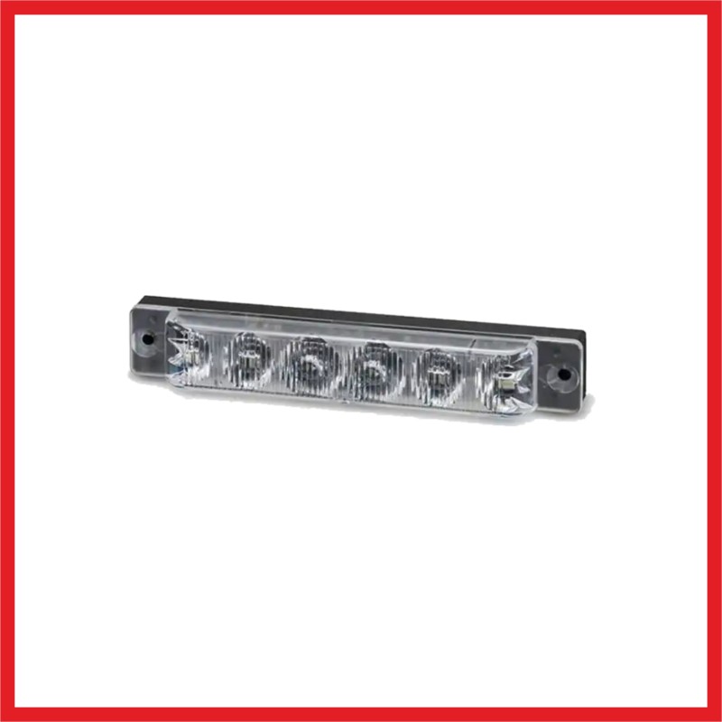 Faretto LED con lenti angolari 180° laterali, 6 LED 3W ultrapotenti Caratteristiche: - 22 pattern di lampeggio - Luce di crociera - Voltaggio: 12~24VDC, - assorbimento: 1A - potenza: 6X3W Dimensioni: Lunghezza: 110 mm; altezza: 17,5 mm; spessore: 18,5 mm;