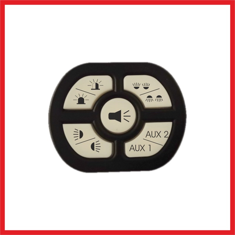 Centralina di controllo 5 tasti retroilluminati a funzione multipla con segnalazione luminosa di attivazione. 9 canali permettono di controllare simultaneamente tutti gli apparati di emergenza/segnalazione luminosa del veicolo. Trasmissione WIFI protetta con protocollo di sicurezza MAC ADDRESS. Ogni canale è internamente protetto sia da cortocircuiti accidentali che da sovratemperatura. Protezione da inversione accidentale di polarità. - 9 canali con uscita al positivo da 6A a 15A - 12/24V con protezione da inversione di polarità - retroilluminazione a doppia luminosità e lampeggio - Funzione EMERGENZA - attivando la sirena si abilita anche il canale dedicato al lampeggiante primario - dimensioni: lungh. 68 mm; alt. 50 mm; spessore 18 mm