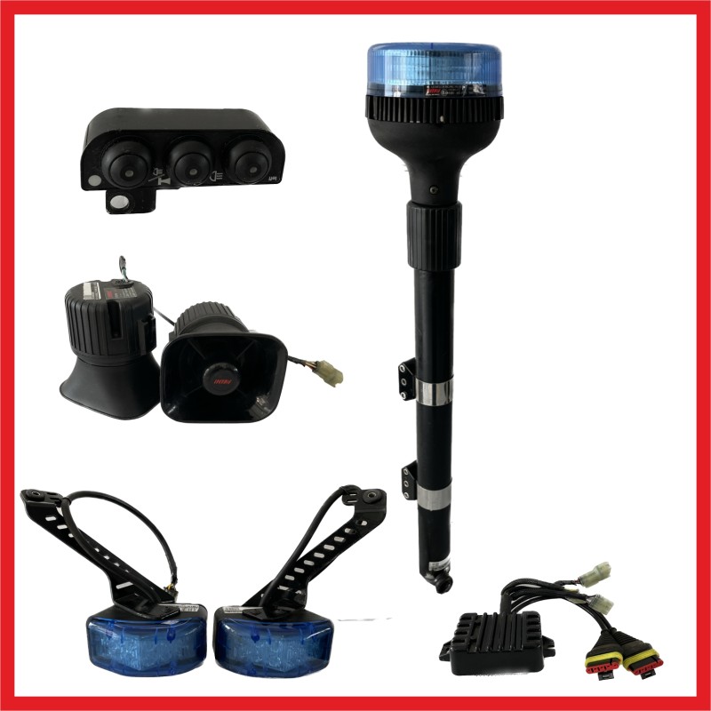 Palo Moto per segnalazione luminosa STROBOLUX USATO composto da palo moto lampeggiante con asta telescopica manuale da 970 mm. centralina di controllo al manubrio (3 tasti) sirena HEPS toni italiani fari lampeggianti LED 2 speaker